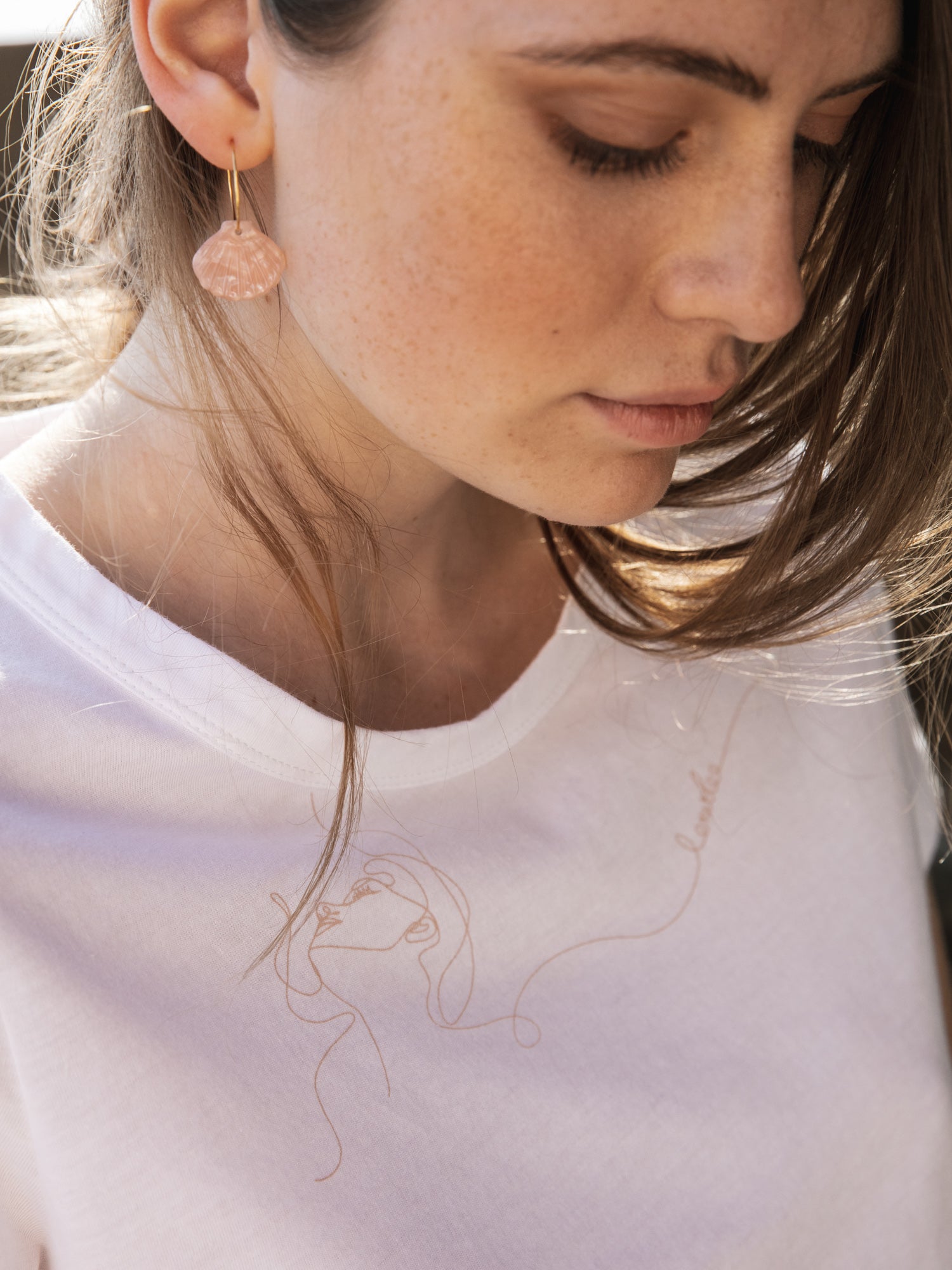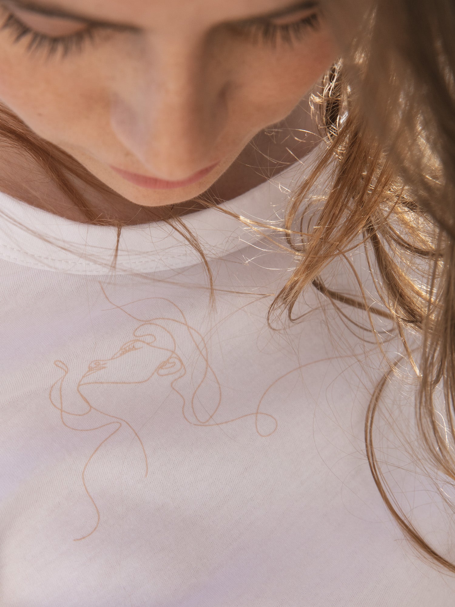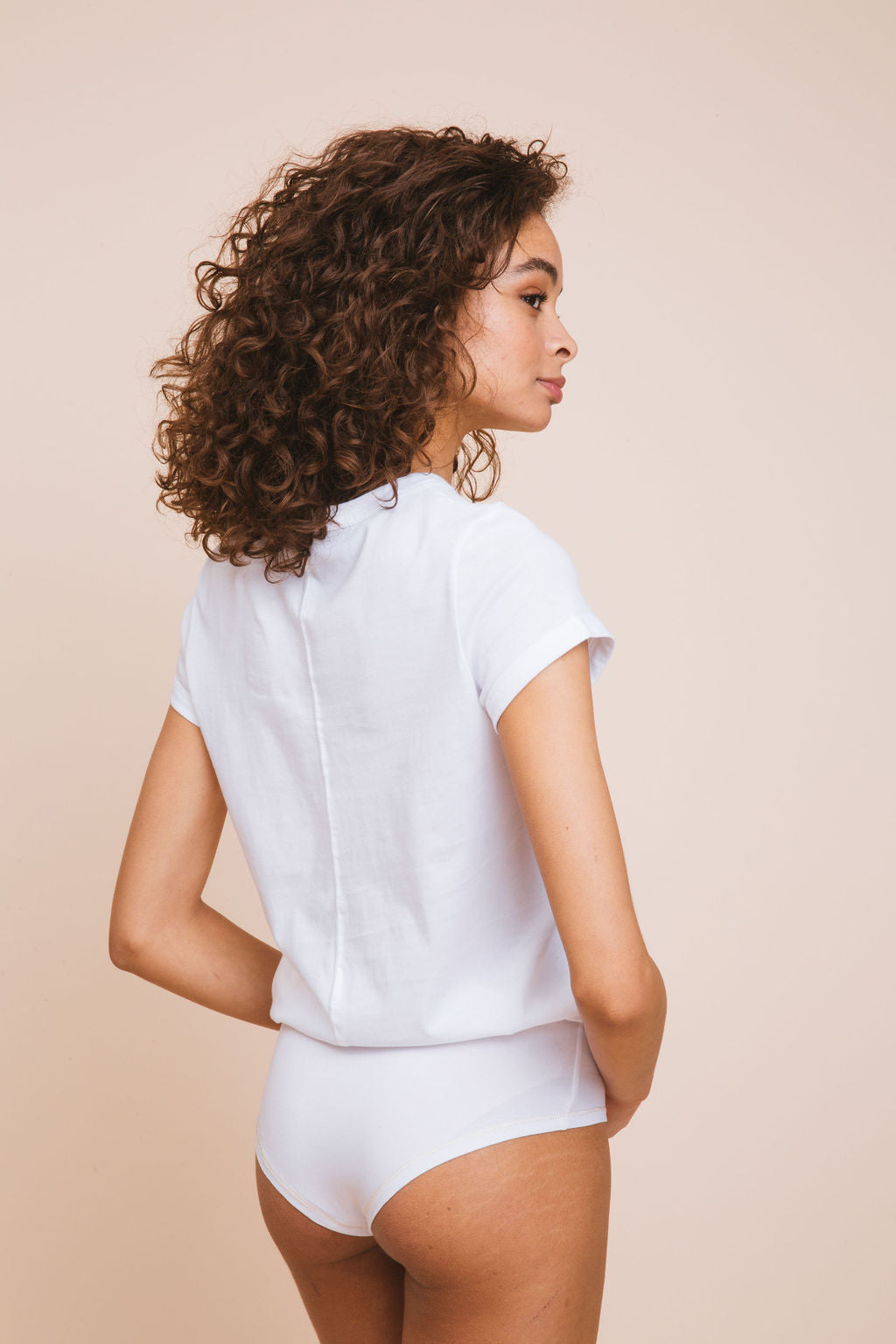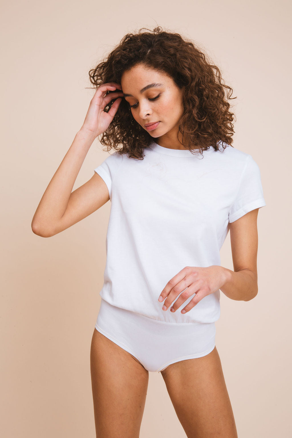 Tee-shirt blanc col rond associé à notre culotte shorty aux coutures dorées. Pas de coutures sur les côtés du tee-shirt mais une large couture sur le milieu du dos. L'illustration de L'envolée est délicatement tracée en couleur nude sur le décolleté, tout en finesse.